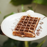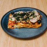 Gaufre au fromage, sauce tomate maison, poulet, huile de basilic, olives noires, oignons rouges et verts. Supplément oeuf au plat plein air : +2€.