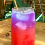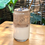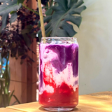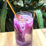 Ube infusé dans du lait (léger goût de patate douce et noisette) avec purée de fruit et sirop de vanille. Cliquez pour voir les options.