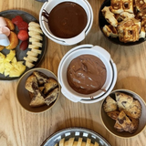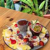 Composée d'une assiette de fruits, un cookie coupé, une gaufre coupée, un pot d'amandes un pot de chocolat. 13,50€ par personne supplémentaire.