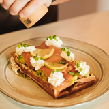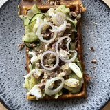 Gaufre au curry de Madras, courgettes marinées, chèvre, miel, pécan torréfiées et oignons rouges. Supplément oeuf au plat plein air : +2€.