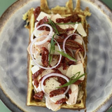 Gaufre au paprika fumé, caviar d'aubergines maison au oignons vert, poulet, parmesan, tomates séchées, oignons rouges et verts. Supplément oeuf au plat plein air : +2€.