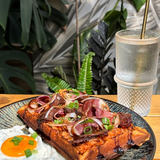 Gaufre au paprika fumé, caviar d'aubergine maison, tranchettes de magret de canard, tomates séchées, crème de balsamique à l'orange et oignons verts et rouges .Supplément oeuf au plat plein air : +2€.